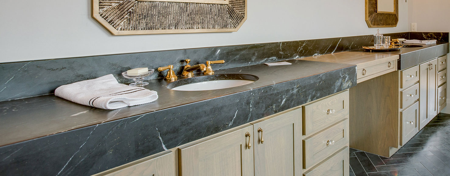 Soapstone is a natural stone that is quarried like granite and is made mostly of the mineral talc, which leads to a soft texture. Soapstone Countertops have a higher percentage of quartz than the usual rock itself in order to make them harder and more durable for kitchens and bathrooms. While Soapstone is not as hard as quartz, it is very dense and fairly easy to clean.